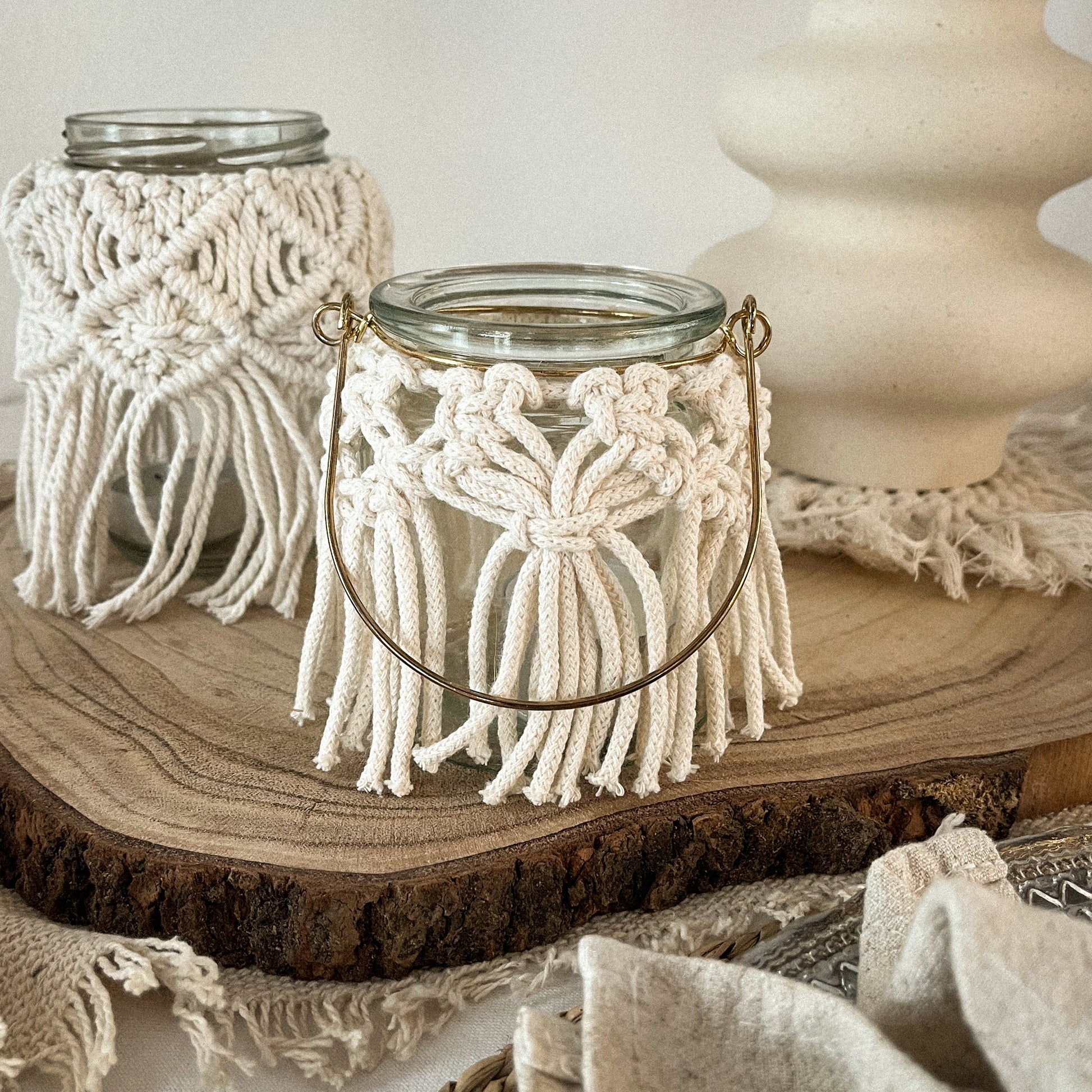 Bringt einen Hauch von Boho-Feeling unter eure Tischdekoration, mit unseren kleinen Makramee Windlichtern. Diese handgefertigten Kunstwerke, mit goldenen Henkel, vereinen traditionelle Handwerkskunst mit einem modernen Boho-Flair und schaffen eine romantische Atmosphäre, die eure Tischdeko unverwechselbar macht. Bei jedem Windlicht enthalten ist ein Teelicht, mit einer Brenndauer von 8 Stunden.