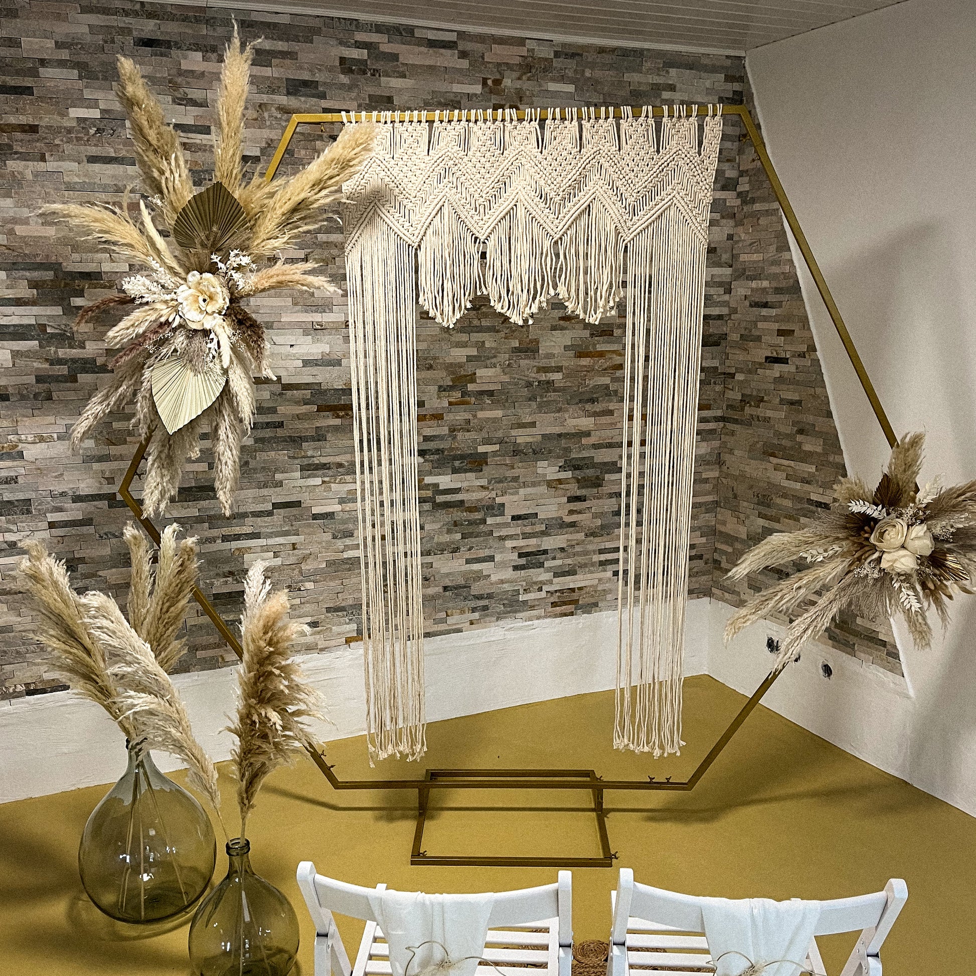 Unser Boho Traubogen mit Makrameevorhang und Trockenblumen ist die romantische Kulisse für ganz besondere Anlässe. Sei es die Trauung der Hochzeit, eine Verlobung oder jede andere Feier, die nach einem Hauch von Eleganz und Natur verlangt.
