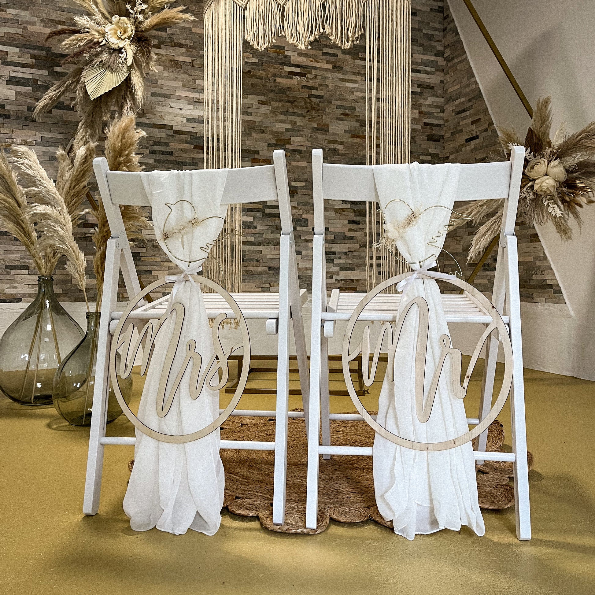 Für Paare, die ihrem besonderen Moment eine Note von Eleganz und einem Hauch von Romantik verleihen möchten, bieten unsere weißen Traustühle mit stilvoller Mrs & Mr Rückendekoration, die perfekte Lösung. Die beiden Stühle schaffen während der Trauung eine romantische Atmosphäre, die lange in Erinnerung bleibt.